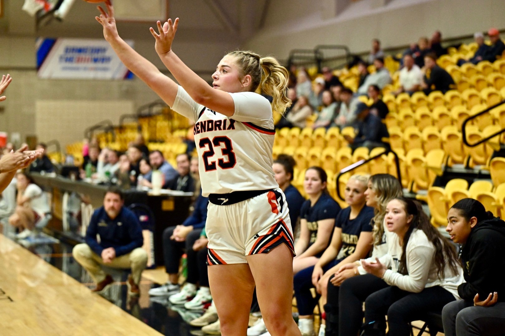 Hendrix shot 56.7 percent (17-of-30) in the first period to take a 46-21 lead into the break. The 46 points was the most in a half this season for the Warriors. The Orange & Black would expand their lead to as many as 29 in the second period.